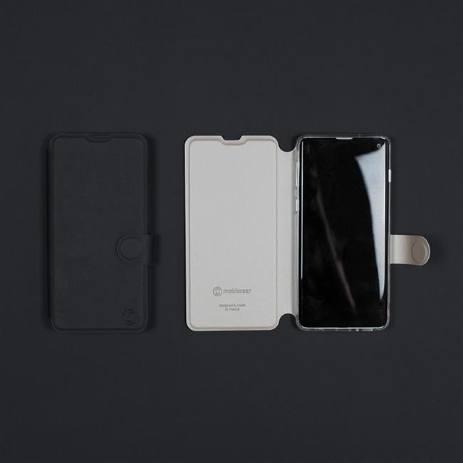 - Etui z klapką marki Mobiwear wykonane w Polsce. Etui do Apple iPhone SE - wzór Satynowa czerń z platyną
