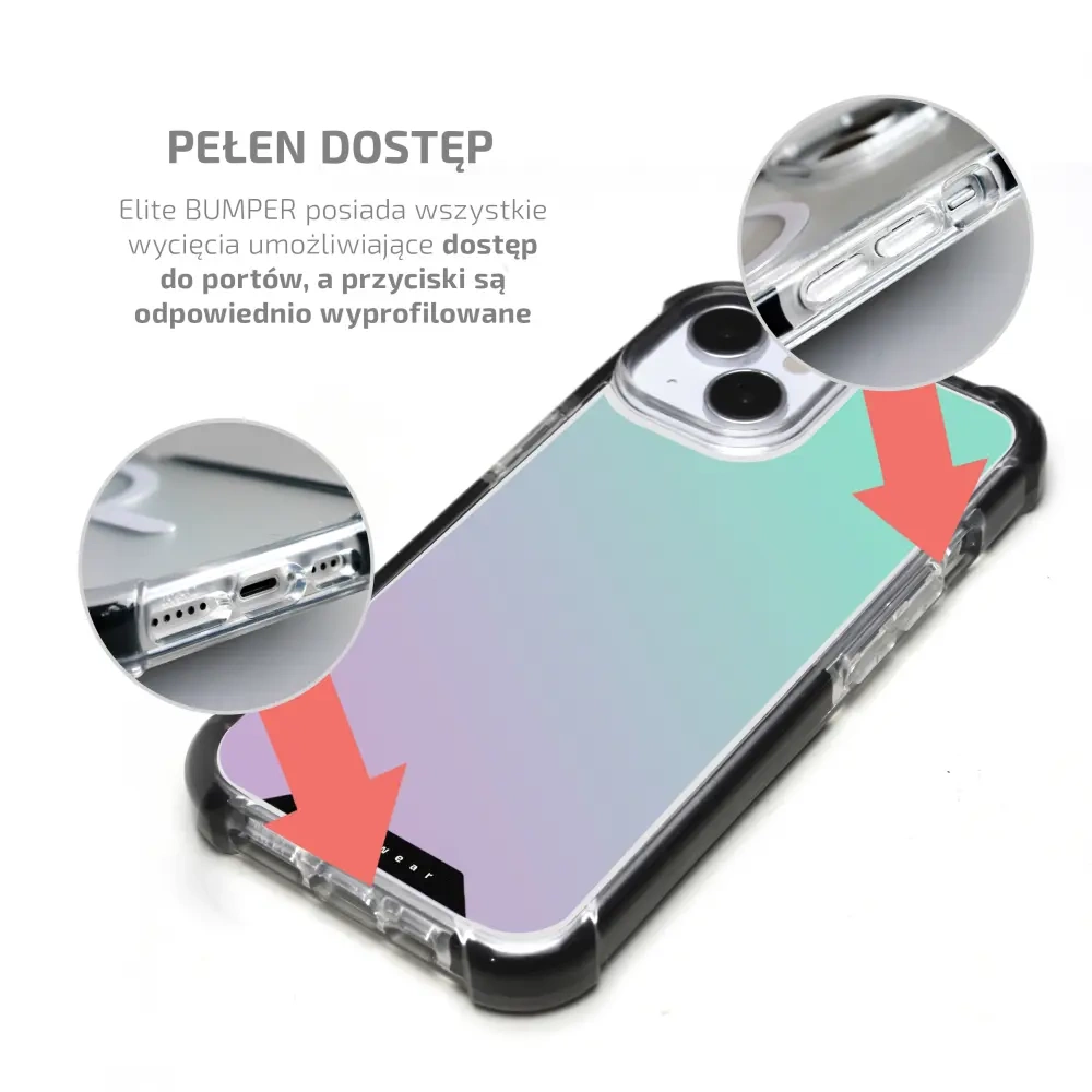 Kluczową cechą etui Elite BUMPER są wytrzymałe "bumpery" umieszczone w każdym z czterech narożników, które zapewniają doskonałą amortyzację w przypadku upadku z wysokości poprzez skuteczne rozproszenie siły uderzenia. Element ten harmonijnie współgra z pozostałymi elementami etui, tworząc kompleksowe rozwiązanie ochronne dla telefonu komórkowego.